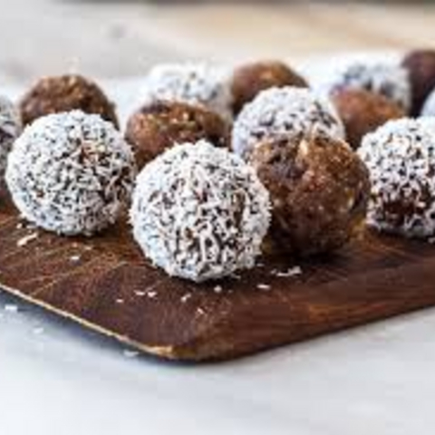 Doe dit allemaal even in de keukenmachine en rol er balletjes van. Bestrooi de balletjes vervolgens ruim met kokosmeel.